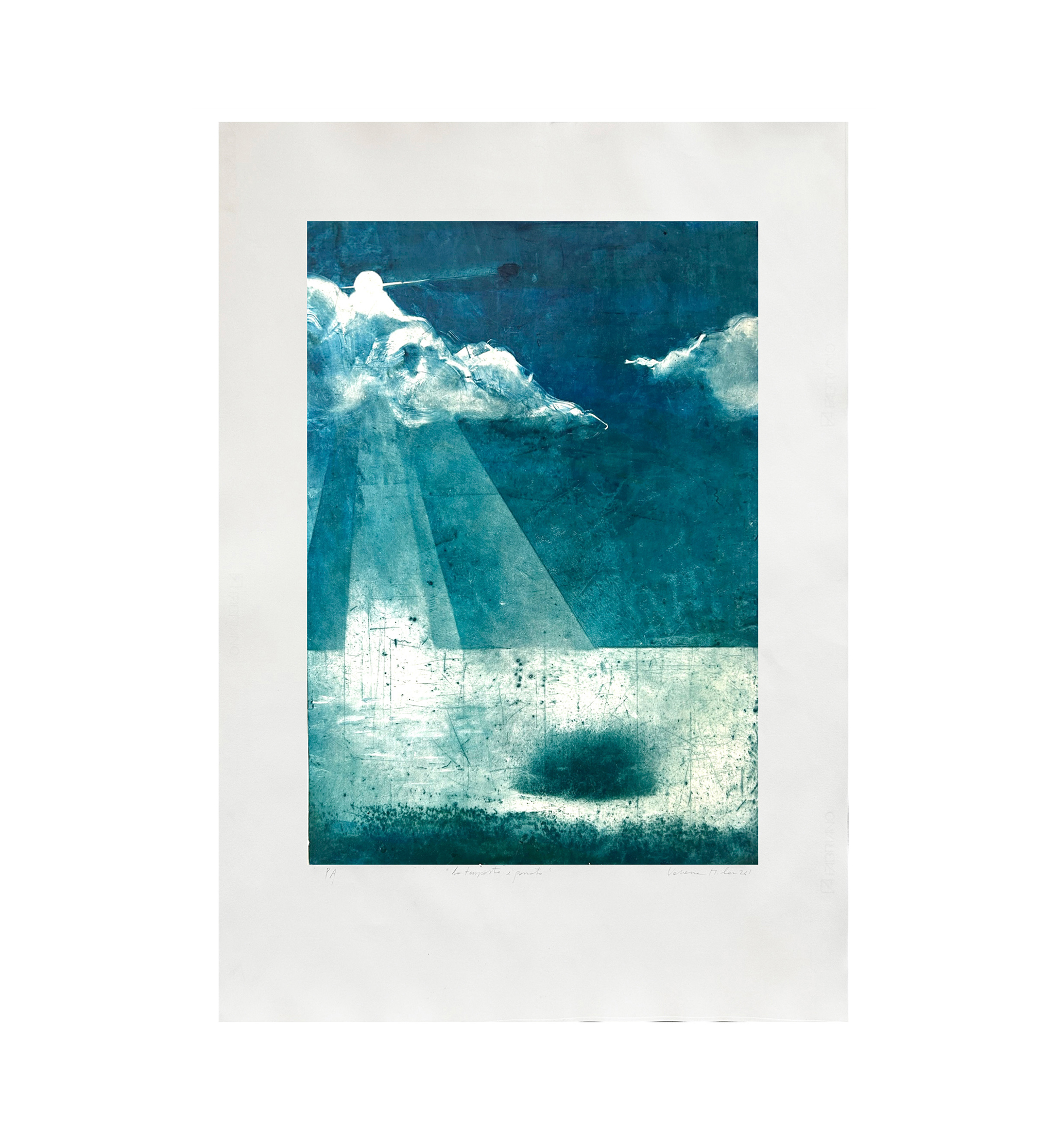 Questo monotipo cattura un momento di calma sospesa, subito dopo una tempesta, quando la luce si fa strada tra le nubi. La laguna si distende quieta, avvolta in una luce morbida e dorata che filtra dalle nuvole spezzate dal vento. I riflessi dell’acqua, che ancora portano i segni del movimento, sembrano respirare con il cielo, creando un legame tra terra e cielo. I dettagli delle ombre e i giochi di luce suggeriscono il ritorno della serenità, trasformando il paesaggio in un momento di rinnovata speranza e pace.