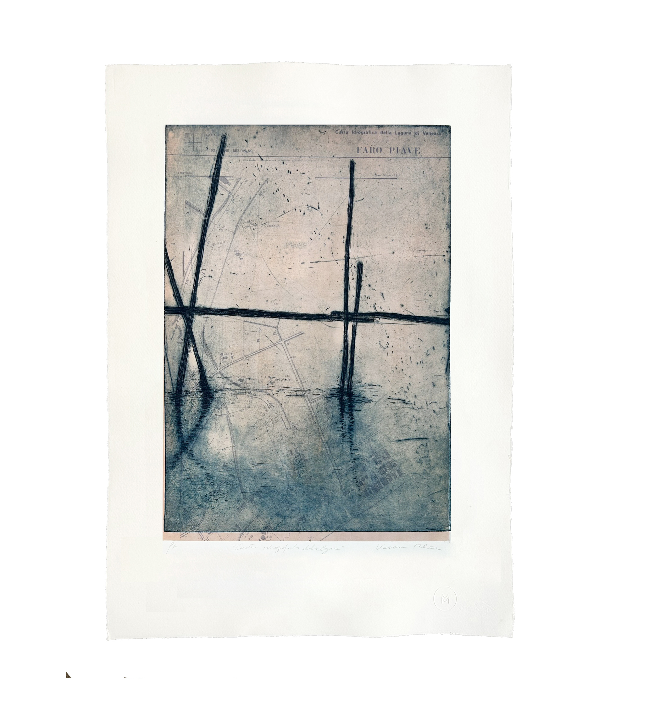 Ogni opera utilizza come sfondo carte idrografiche della laguna veneziana risalenti agli anni ’60, su cui sovrappongo la mia incisione.